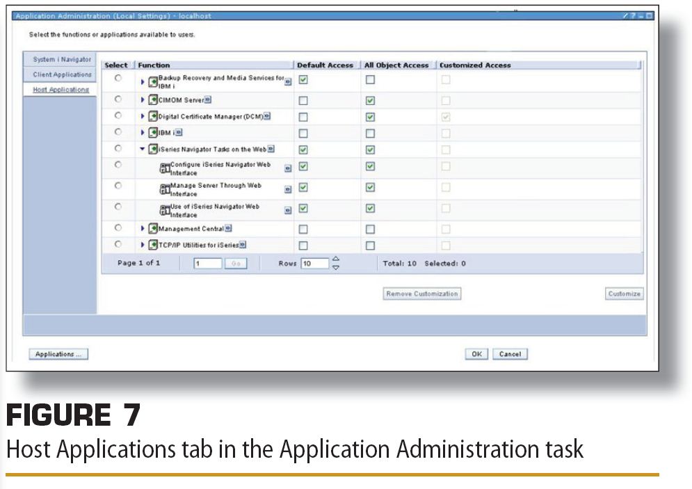 アプリケーション管理UIの左側にあるナビゲーションでアクセスできるもう1つのパネルがホスト・アプリケーションです(図―7)。Director Navigator for iをセキュアにするためには、このツリー表の5番目のエントリであるiSeries Navigator Tasks on the Webに注目しなければなりません。この機能カテゴリ内にはIBM i環境をセキュアにするのを支援してくれる2つの設定があります。しかしそれを説明する前に対象システムの考え方について説明する必要があります。Director Navigator for iでは以下の2つのことを決めることができます。
