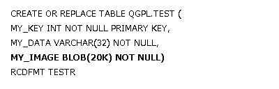 RPG プログラムで BLOB データが必要な場合は、データ構造を手動で定義しなければなりません。この例は 20K 長の BLOB を使用しているだけなので、(特殊 SQLTYPE を使用して定義された) 1 つの RPG 変数に読み込むことができます。