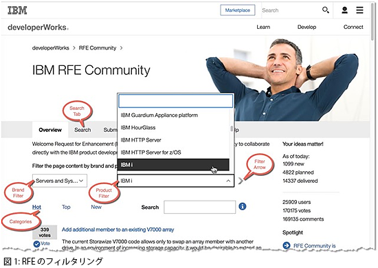 今振り返ってみると、方法はあります!IBM は、Requests for Enhancement、略して RFE(改善のリクエスト) という IBM developerWorks サイトでアイデアを共有するためのオンライン・プロセスを用意しています。RFE プロセスは、素晴らしいアイデアを持った誰もが、そのアイデアを提案として IBM に提出できるものです。さらに重要な点として、RFE では他者が提出したアイデアをサポートすることができます。意見を集めることで、散らばった大量の提案の中で、相対的な重要性を提供できます。これは実装する内容に対する意思決定プロセスの重要な部分です。