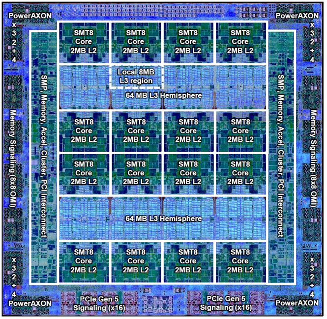 これらのデキャップ セルは、Power10およびPower11デザインの至る所にまんべんなく分散されているのでしょうが、チップ ブロック図でその姿を確認することはできないでしょう。Power10のブロック図を見てみましょう。基本的にPower11と同じです。