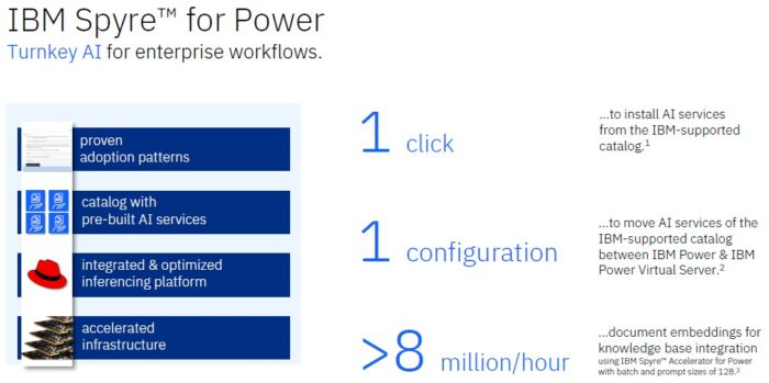 10月7日付けの 発表レター「AD25-1422」で、IBMは、10月28日より、Spyreアクセラレーターがz17メインフレームおよびそれらのLinuxONEバリアント上で利用可能となることを発表しました。この発表レターでは、性能データや価格設定に関してあまり多くを述べていませんが、IBMは、Spyreカードは、RHELサブスクリプションにより、エンタープライズ サポート付きで、PCI-Expressエンクロージャーと8枚のカードのバンドルで販売されると述べています。 発表レター「AD25-1365」では、12月12日より、Spyreバンドルおよびシャーシが、RHEL 9.6以降を稼働しているPower11サーバー(Power10またはPower9ではなく)で利用可能となるとIBMは述べています。