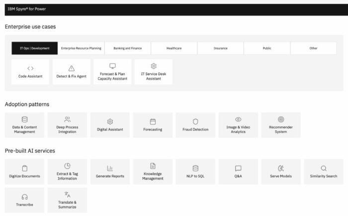 これは、あまり参考にはなりません。しかし、Power向けSpyreスタックのエンタープライズ ユース ケースのスクリーン ショットは興味深いものがあります(下図)。