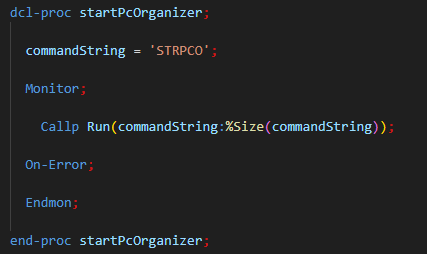 まずは、PCオーガナイザーを開始(STRPCO)するのに必要となる、QCMDEXCプロトタイプを定義します(図1)。PCコマンドを実行するには、PCオーガナイザーが稼働している必要があります。PCオーガナイザーは、PCコマンドが実行されるジョブで一度開始する必要があるだけです。