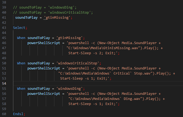 これらのサウンドのうちの2つは標準のWindowsサウンドであり、それらはPC上にすでに存在しているはずです。しかし、私は記事前半で、カスタム サウンドを作成すると述べました。この場合、プログラム内のパスが、そのサウンドの場所を示していることを確認する必要あります。標準のWindowsサウンドではないため、カスタム サウンドは、このRPGプログラムを実行する予定のすべてのPCで、同じ場所に置かれるように注意する必要があります。