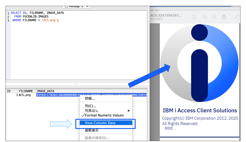 ACS 1.1.9.8では、BLOB、BINARY、VARBINARYといったバイナリ型の列に対して、SELECT文の実行結果からその内容を直接確認できるようになりました。
