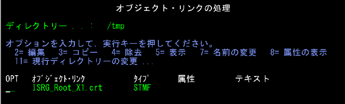 - ルート証明書をIBM i (AS/400)の統合ファイルシステム(IFS)に設置する - PC上にダウンロードした証明書を、IBM i (AS/400)の統合ファイル・システムに設置します。 - 以下は、Windowsのコマンドプロンプトを使用した転送例です。 - C:\Users\XXXXX>CD DOWNLOADS C:\Users\XXXXX\Downloads>FTP IBMI XXX.XXX.XXX.XXX に接続しました。 220-QTCP AT IBMI. 220 CONNECTION WILL CLOSE IF IDLE MORE THAN 5 MINUTES. 501 OPTS UNSUCCESSFUL; SPECIFIED SUBCOMMAND NOT RECOGNIZED. ユーザー (XXX.XXX.XXX.XXX:(none)): BELLDATA 331 ENTER PASSWORD. パスワード: 230 BELLDATA LOGGED ON. ftp> CD /tmp 250-NAMEFMT SET TO 1. 250 "/tmp" IS CURRENT DIRECTORY. ftp> BIN 200 REPRESENTATION TYPE IS BINARY IMAGE. ftp> PUT ISRG_Root_X1.crt 200 PORT SUBCOMMAND REQUEST SUCCESSFUL. 150 SENDING FILE TO /tmp/ISRG_Root_X1.crt 226 FILE TRANSFER COMPLETED SUCCESSFULLY. ftp: 1604 バイトが送信されました 0.02秒 100.25KB/秒。 ftp>- これにより、IFS上に証明書が転送されました。 - IBM i (AS/400)上で確認したい場合は、コマンド「WRKLNK」を使用します。 - 例:WRKLNK OBJ('/tmp/ISRG*')  - これで、インポートするための前準備が完了です。