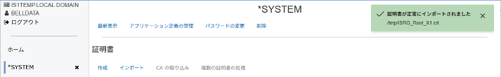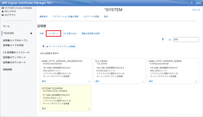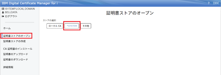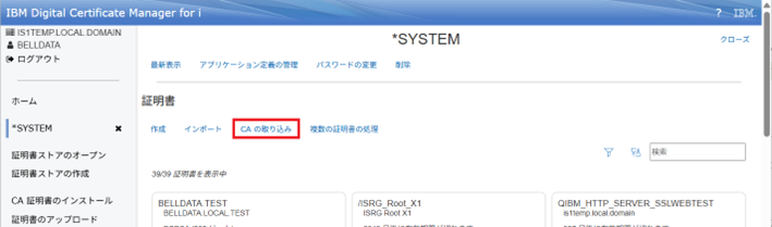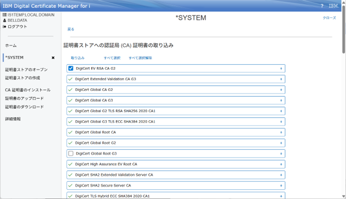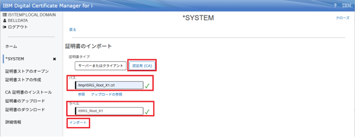 - DCMにより証明書のインポートを行う - 次にDCMにより証明書をインポートします。 - そのためにはまずDCMにアクセスします。管理者権限のユーザーにてログインしてください。   - ログイン後、証明書ストアを選択します。通常は「*SYSTEM」を使用します。   - もし証明書ストア「*SYSTEM」が存在しない場合はストアを作成してください。 - 証明書ストア「*SYSTEM」をオープン後、「インポート」をクリックし証明書のインポートを行います。   - 今回はルート証明書のインポートなので「認証局(CA)」を選択します。 - その後、IFS上にアップロードしたファイル名を指定、ラベルの指定(わかりやすい名前にする)を行い、「インポート」をクリックします。   - 「証明書がインポートされました」のメッセージが出れば、インポート完了です。   - 今回は「ISRG Root X1」をサンプルとしていますが、いくつかのルート証明書は、IBM i 側にも実は標準で持っています。 - 昔のシステムではすべてインポート済みでしたが、今はデフォルトでは登録されておらず、必要に応じて取り込む必要があります。 - 以下は、OS標準の証明書を取り込む方法です。 - 証明書ストア「*SYSTEM」にアクセス後、「CAの取り込み」をクリックします。   - IBM i が持っているCA証明書の一覧が表示されますので、取り込みたい証明書を選択します。 - すでに導入済みのものはチェックが入っています。   - 「取り込み」をクリックしていただくと、対象の証明書がインポートされます。