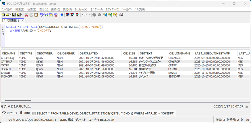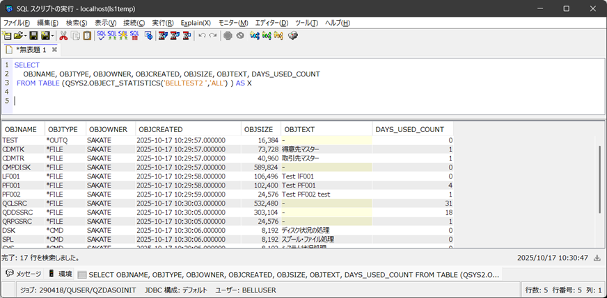 「OBJECT_STATISTICS テーブル関数」は、SQLにてオブジェクト情報を表示しますので、例えばライブラリー内のオブジェクト情報を一覧で表示する事も可能です。