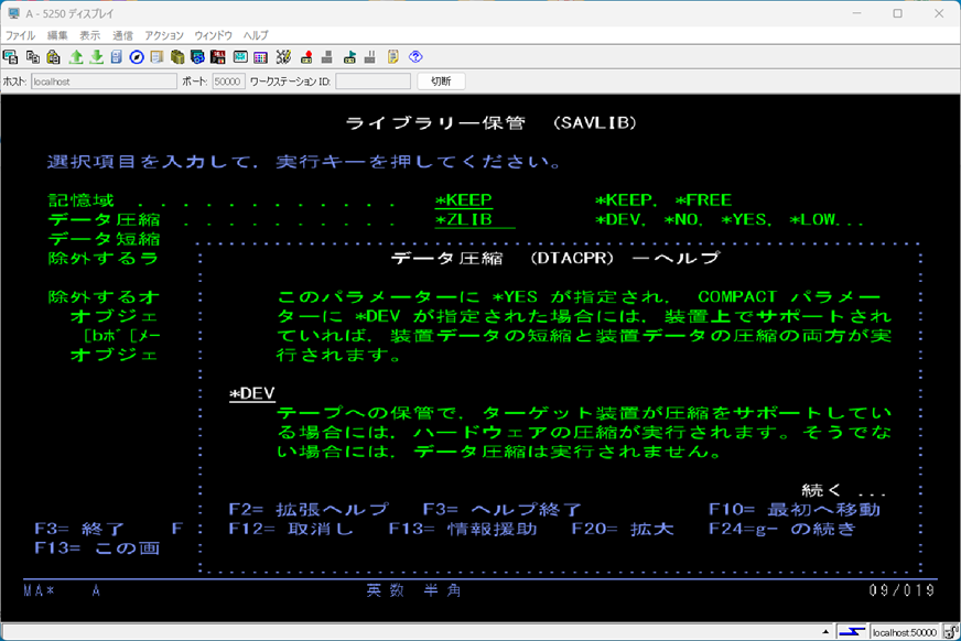 この例では、SAVLIBコマンドの「データ圧縮」を初期値*DEVから*ZLIBへ変更しています。