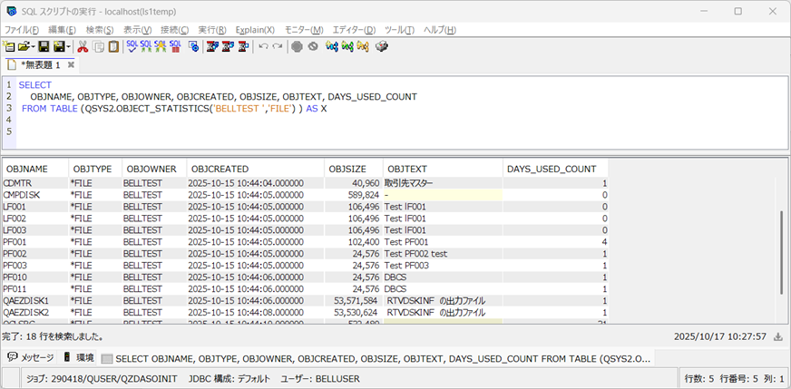 ※SQL例:ライブラリー BELLTEST内のオブジェクト一覧を表示します。