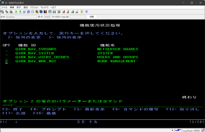 - 機能ID 「QIBM_NAV_WRK_MGT」の行へ「2=使用の変更」を入力し実行キーを押します。