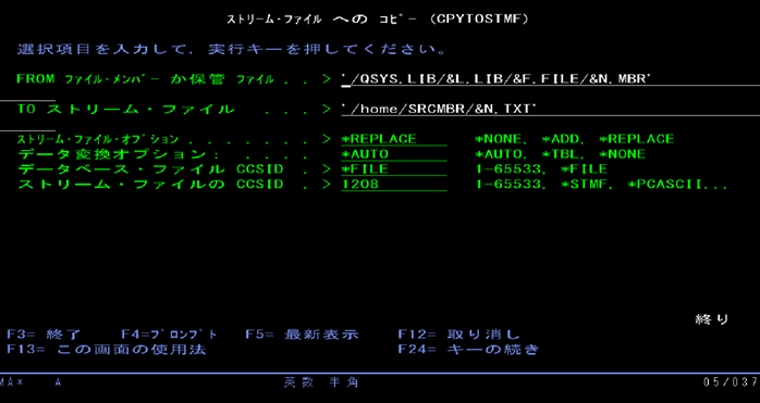 CPYTOSTMF FROMMBR('/QSYS.LIB/&L.LIB/&F.FILE/&N.MBR') TOSTMF('/home/SRCMBR/&N.TXT') STMFOPT(*REPLACE) DBFCCSID(*FILE) STMFCCSID(1208).F4キーを押してCPYTOSTMFコマンドの各パラメータ値を確認します。