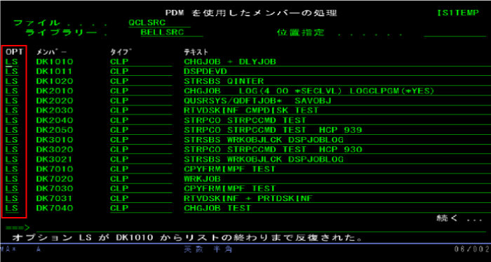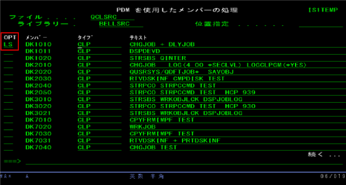 テキストファイルへ変換するソースファイルをプログラム開発管理機能 (PDM)のOPT=3の「3. メンバーの処理 」或いはPDM 使用のメンバーの処理 (WRKMBRPDM)で開き、OPTへ LS を入力します。
